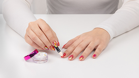 Then immediately use the included applicator brush to pick up the flakes and press them onto the nail surface.