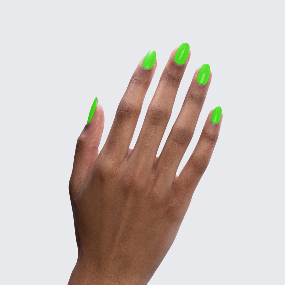 Neon green. Bright. Cool undertone. Medium opacity (slightly translucent).